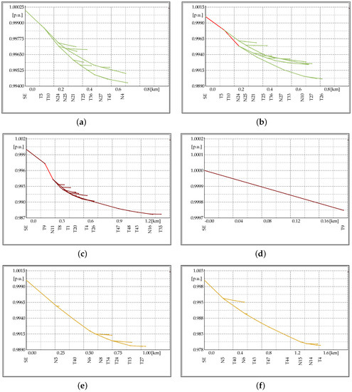 A set of six subfigures: (a) Voltage profile of distribution feeder A under normal conditions (b) Voltage profile of distribution feeder B under normal conditions; (c) Voltage profile of distribution feeder C under normal conditions; (d) Voltage profile of distribution feeder A after a feeder’s reconfiguration; (e) Voltage profile of distribution feeder B after a feeder’s reconfiguration and (f) Voltage profile of distribution feeder C after a feeder’s reconfiguration.