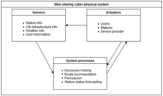 Traditionally, the following elements can be considered as core parts in bike sharing systems: bicycles, stations and users. The intertwined relationship between the three, as well as the digitization of cities, including bike sharing systems, makes it possible to consider the new generation of bike sharing systems as cyber-physical systems. These systems integrate computing, engineered elements and human factors, and there are reciprocal feedback loops between the three of them, changing the behavior of all of the actors in the system [24]. On the one hand, bikes and stations have integrated and engineered technologies that record information from physical events (e.g., state of the parking stations, location of the bikes, etc). This information flows from the physical devices to the information systems that are employed by system operators. This information helps to make decisions about the redistribution and use of resources by the system operator. In addition to this, many system operators also provide free information services to users about the state of the network, thus influencing their behavior. As mentioned, decisions made by system administrators on the distribution of physical resources (i.e., bikes) across stations directly impacts customer satisfaction and system adoption. In many occasions, given the size of the system, many of these decisions are supported by software and information technology. Obviously, users also influence the physical system, as they move and distribute bikes across the different stations of the city. Indirectly, this also affects the decisions made by system operators. As the reader may observe, there is a close relationship between the physical resources of the system, the computing involved, and the human actuators, making this a clear cyber-physical system.