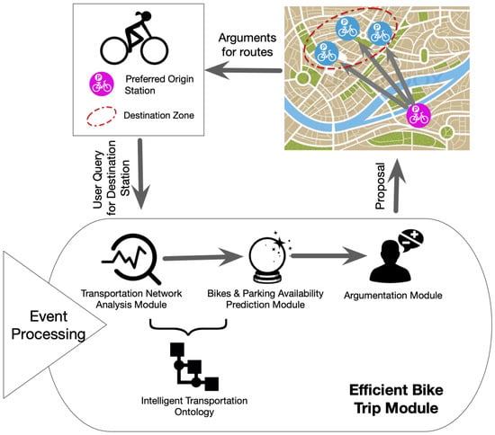 As an overview, the system operates as follows: first the user determines his preferred station to start the trip and his destination, making the system aware of the user’s initial intention. After this, when the system wants to prevent the user from going to the selected destination station, it chooses an alternative station close enough, and the system uses the information provided by the transportation network analysis module and the bikes an parking availability prediction module to determine possible routes that may be interesting to the user and, ultimately, help to balance the bike sharing system. Lastly, the argumentation module computes arguments in favor of the generated routes (taking into account the user preferences), and the system presents them together to the user with the aim of changing his/her behaviour. Note that the recommender system should only act in the event that it is predicted that the destination station will not be available, or allowing the user to park the bike in the station will significantly impair the system for the purpose of its overall balancing. This general view of the proposed architecture is shown in Figure 2 and it is presented and further discussed in [25].