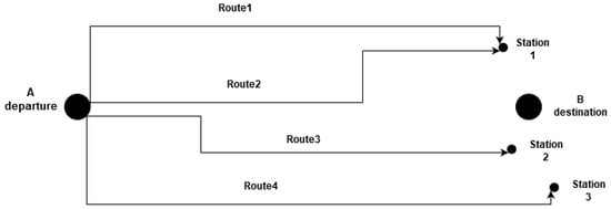 In this section we present an example scenario that allows us to illustrate how the persuasive recommender system works. In Figure 3 we present the scenario where the example is going to be framed. In this scenario there is a user that wants to transfer, using a bike sharing system inside a city from point A to point B. In order to simplify the trace, the starting point is a station, so we are not dealing with recommending a starting station in this example. The example is focused on the recommendation of a target station close to the user’s desired destination. The destination is the place in the city where the user desires to arrive. It is not a station, as it usually is shown in other tools that service providers offer. This is because our persuasive system suggests the most interesting stations for both the user and the system; the station that strikes a balance between being close to the user’s destination and balancing the whole system in terms of free spots and available bikes. Moreover, the system can consider the full route features instead of just the destination stations, adding more information from those alternative routes and guiding the user through the whole transfer process.