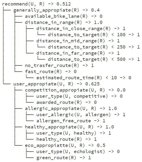 Therefore, arguments for recommending a route were generated by backward chaining of facts and defeasible rules. With this recursive method, the system was able to create a dialectical tree whose root was the target argument of discussion (i.e., whether to recommend or not a bike route for a specific user), and whose children nodes were arguments that defeat their predecessors [29].