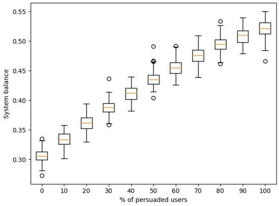 Figure 5 shows the average result of the set of experiments performed confronting the system balance evolution regarding the percentage of users persuaded. This figure shows how positive it is to persuade users to move to alternative stations selected by the system (instead of letting them decide). The more users persuaded (the better the persuader) the better balanced the objective system will be. This, as it can be seen in Figure 5, improves the balancing measure by up to 21.01%.