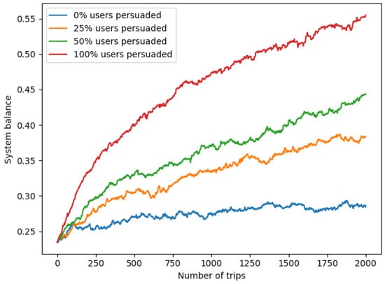Figure 6 shows how the system improves over time when a persuasion module such as the one proposed in this paper is included. In this figure the number of trips over time is shown. This is compared to the system balancing for four different configurations of persuasion (0%, 25%, 50% and 100%) acceptance. As it can be observed, when the recommendation strategy is not used, the system balance does not improve along time. However, this changes when we increase the percentage of users persuaded to accept the system recommendations, which enhance the balance accordingly with the acceptation ratio. In particular we can see how, when we convince 25% of users the improvement is 15.25%, when we go to convince 50% of users we improve up to 20.89% and if we convince 100% of users we would have an improvement in the system balance of 32.02%. This experiment shows us that the longer the persuasion is running, the better the balancing results of the system will be achieved. Analyzing these results, we can conclude that our recommendation strategy results in a positive impact for the overall system balance.