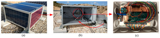 (a) c-Si PVCube installed on the rooftop of one of the buildings at the University of Murcia. Orientation of each face is south, north, west, east and horizontal (top). (b) Inside of the c-Si PV-cube: Temperature sensors are attached to the back and frontside of each photovoltaic (PV) module. Additionally, in the centre, temperature and humidity sensors are installed. (c) Data logger system: Arduino and Xbee transmitter, both installed inside of the PVCube.