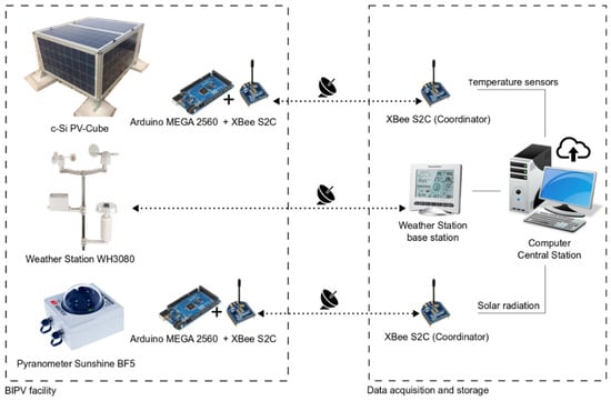 A wireless sensor network, using the ZigBee protocol, has been built to monitor in real time the thermal response of the PV modules. The system is low cost, features easy placement and installation, and is scalable in terms of the number of sensors nodes. DS18B20 and DTH11 temperature and humidity sensors were used to obtain the temperature of each PV module and the temperature and humidity from the inside of the PVCube, respectively. The monitoring system works by combining an Arduino board (model MEGA 2560) and Xbee radio frequency communication module (model S2C), both connected to a home-made printed circuit board for power supply and easy connection of all the sensors. Everything is installed in a sealed box inside of the PVCube (see Figure 1b,c). The network is completed by adding another sensor node with the data collected by the pyranometer (model Sunshine BF5) and adding the Xbee modules (configured as coordinators), which are connected to a PC located at the laboratory on the lower floor below the rooftop, where all the data is saved to a text file using the serial terminal program Coolterm [].