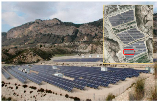 The 2.12 MWp Yéchar photovoltaic plant (Murcia), in the inset the sector of modules which have been monitored using thermographic camera is shown.