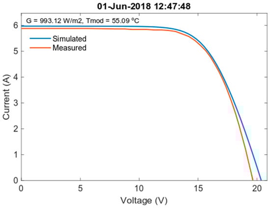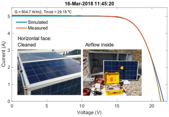 Measured and simulated I-V curve for the horizontal face when the PV module was cleaned and one face was opened, allowing airflow inside of the structure. The measured I-V curve was obtained by the I-V tracer PVPM 1000CX. The simulated curve, solving the single-diode equation through toolbox, was developed by Sandia National Laboratories, using a PVSyst model and setting as inputs the in-plane irradiance, module temperature, and specifications given by the PV module manufacturer at standard test conditions. Further details about the toolbox and modeling functions can be found in [,].