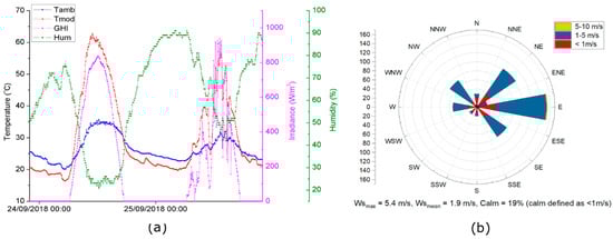 Ambient and thermal parameters during summer time, covering two characteristic days: Clear and cloudy (from 23/09/2108 22:00 to 25/09/2018 22:00, GMT 0, n = 617). (a) Thermal evolution of the module (Tmod) located at horizontal face compared to ambient temperature (Tamb), global horizontal irradiance (GHI) and relative humidity (Hum). (b) Wind speed distribution with details about the maximum (Wsmax) and average (Wsmean) wind speed.