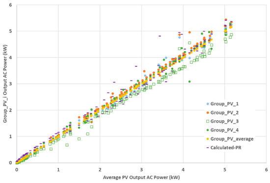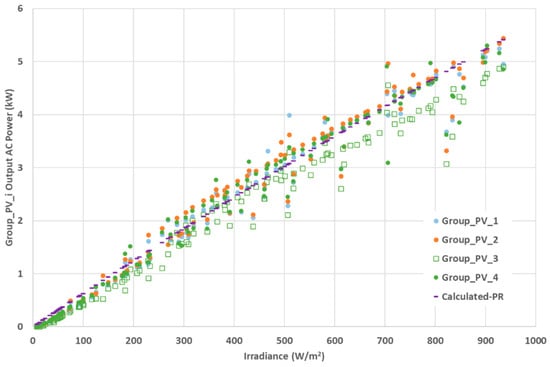 This method of cross-correlation for a massive amount of data is very reliable, as can be seen in Figure 9, where the faulty string (Group 4, green open squares) is showing a strong underperformance when compared with the other groups or the average value of several groups at all output powers. This kind of failure is not detected automatically by the single inverter, since the group is behaving correctly. The theoretical output presented in the previous section is also superimposed in Figure 9, to show how the identification of the faulty string is clearer with the cross-correlation than the modelling (as shown by comparing Figure 8 and Figure 9) due to the uncertainty in the technical parameters and the measurement of the environmental magnitudes used for the model calculation.