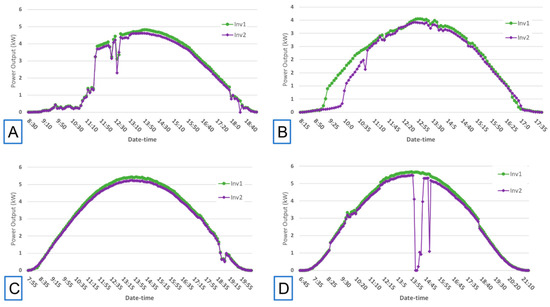Power output of two groups of modules with same nominal power and same location. Four days are shown from different season: (A) October, (B) December, (C) April and (D) June.