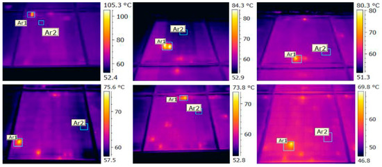 In Figure 10, thermographs of six panels in which failures were detected by temperature gradients are shown. Two areas are indicated in each picture: One containing the highest temperature (Ar1) and other containing a medium-low temperature area (Ar2). The maximum temperature within each area was compared and a gradient was obtained and used to classify the failures. Only six representative images showing clearly the presence of overheating are shown here. A total of 245 thermographs were obtained, with 66 of them showing a ΔT larger than 5 °C.