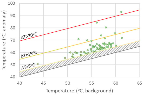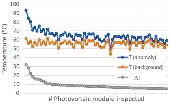 Figure 11 and Figure 12 show the distribution of temperatures between the anomaly and background areas of all 66 modules which can be considered as failures according to the criteria explained in the methodology section. In Figure 11, the distribution of temperatures is shown (ordered by the amount of ΔT, from higher to lower, left to right), with only a few modules showing temperatures above 70 °C. All of them have a very large ΔT (grave or medium fault). In Figure 12, a cross-correlated plot is presented, and the distribution of failures can be easily identified by the superimposed lines marking ΔT in excess of 5 °C, 15 °C and 30 °C, respectively. A certain correlation is shown which relates the higher range in module temperature with higher ΔT, but it cannot be considered a consolidated trend due to the dispersion of the data. All modules inspected with ΔT < 5 °C will be in the grey striped area. Once the modules with grave and medium failures were detected, visual inspection of the modules indicated that the grave failure were due to a fractured cell, the medium failures also included a fractured cell, but all others failed due to failure of the welding of string contacts within the module. In the remaining 59 light failures, all but four were string welding problems, the four remaining being a problem with the connection box between modules (three cases) and a possible problem with the bypass diode (one case).