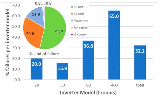 Finally, and also focused on the Yéchar solar plant, the failures detected in the Fronius inverters are summarized in Figure 13. The number of failures was high after ten years of operation, providing an average of 32.2% between all models, with a special incidence of high power inverters (65%, with failures in the power stage). The number of inverters inspected was high (279), providing significance to the statistical values, especially for models 30 and 60, which were the most used. All of the inverters have been working in the same environmental conditions, and therefore this sample is very useful to test the reliability of models from the same manufacturer. From this study, it is clear that smaller inverters are more reliable. The distribution of failures is included as a pie chart inset in Figure 13. The AC card (53%) and DC card (29.8%) failures (percentages over total number of failures detected) are the parts which required more reparations, followed by the power racks (14.9%, over total, but with special incidence in the largest model 400 inverters, as can also be seen from the 65% of them which failed). Reparation of the inverters requires manual operation and it is therefore expensive. Preventive detection for this kind of failure will require analysis of trends of power output and machine learning procedures to provide alert signals before the actual failure occurs.