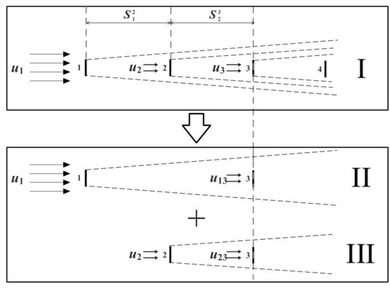 Except for the GS model, all models first calculate the wake losses of each upwind turbine at the position of the target turbine and then overlay them as the total loss due to upwind turbines. Hence, the only distinction between the superposition models is that the wake deficit is expressed in different ways. Figure 1 gives a schematic for the typical wake superposition along a row of four turbines. As shown, wind turbine 3 is located in the superimposed zone of upwind turbines 1 and 2. When calculating the velocity distribution before turbine 3 in scenario I, first, the superposition should be divided into scenario II and scenario III. Then, the wake deficits caused by turbines 1 and 2 are computed separately and finally combined as the total loss caused by upwind turbine.