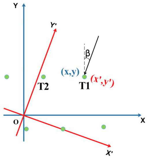 When the wind direction changes, the wind turbine conducts yaw control to ensure that the rotor swept plane is always perpendicular to the inflow direction, which changes the relative positions of the turbines and the wake effect. Therefore, determining the relative position of wind turbines efficiently under arbitrary wind direction is a required process for predicting wake deficits [41]. We use a simple method to solve this problem in this research. As shown in Figure 2, north is regarded as 0° and has the established coordinate frame XOY. The coordinate origin can be chosen from any point in the wind farm, and the Y axis points to the 0° wind direction. T1 represents an arbitrary wind turbine with position (x, y). When the wind direction changes to β, the coordinates are rotated β degrees clockwise and a new coordinate system X’OY’ is obtained. The coordinates of the wind turbine in frame X’OY’ can be obtained by: