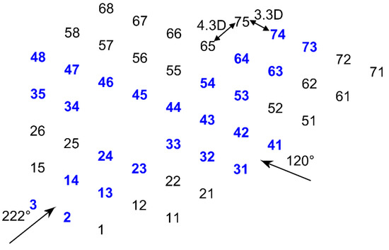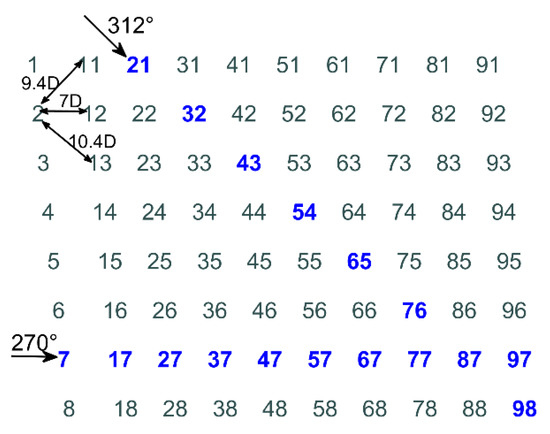 The Horns Rev I offshore wind farm is located about 14 km off the west coast of Denmark. It has been extensively studied in evaluating its wake effect and power production, with plenty of meteorological and SCADA data available for comparison. The wind farm consists of 80 Vestas V80 2 MW turbines with a rotor diameter of 80 m and hub height of 70 m. The wind farm’s 10 columns and 8 rows are aligned in a parallelogram shape, as seen in Figure 7. The spacing distance between turbines in both lines and columns is 7D, and those under the wind direction of 221° and 312° are 9.4D and 10.4D, respectively.