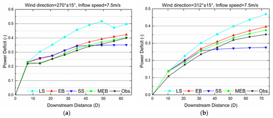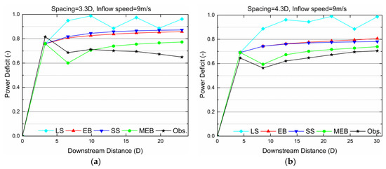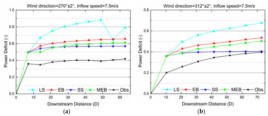 The co-axial arrangement of wind turbines can be observed in the above two directions. In order to test the accuracy of different models, the Jensen model is combined with three previous interaction wake models (LS, EB, SS) and with the proposed MEB model to calculate the power deficit along rows with and without missing turbines (in blue in Figure 3). The inflow mean velocity at hub height is 9 m/s in all cases. The wake expansion rate of the Jensen model is set to be 0.05 according to the recommended value for offshore conditions. The calculations are performed for various wind directions, consistent with those of the inflow sector of processed SCADA (Supervisory Control and Data Acquisition System) data [−2.5°,2.5°] [11], and are performed in 0.5° steps for both arrays in this research. The results for these cases are given in Figure 4 and Figure 5. The power deficit of the wind turbine can be defined as , where is the actual power of a specific turbine i and is the power of a turbine not disturbed by a wake.