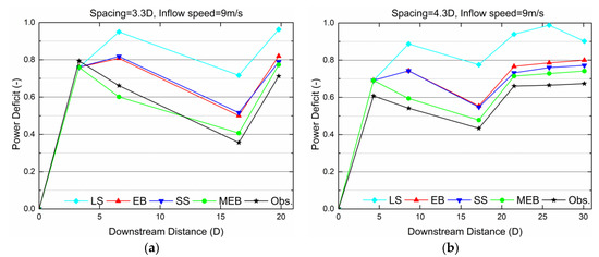 Figure 4 shows the variation of power deficit for different turbine separation distances in the complete arrays along the two directions. In these two cases, the results from the EB model and SS model are very similar, while the LS model seriously over-predicts the deficit and presents a zig-zag pattern. This is because when the calculated inflow is less than the rated speed of the wind turbine, the turbine will stop operating, and no wake is produced in this study. Specifically, without a superposition effect, the power deficits of the second turbine predicted by different models are the same and reach up to about 82% and 65%, respectively, because of the small spacing. As for the third turbine, the power deficit significantly decreases compared with the former one. Neither of the three typical models could capture this trend, but show rather a continuous decrease of power. Only the proposed MEB model perfectly predicts the power recovery of the third turbine. For the case with 4.3D spacing, the MEB model simulation results of the fourth and subsequent turbines agree very well with observations. However, what should be noted is that none of the superposition models predict the trend of power recovery after the third turbine for the case of 3.3D spacing. Perhaps this is because of the error in the single wake model due to the overly close spacing of 3.3D. Katic [17] also admitted that the calculation of the near-wake zone will involve large errors using the Jensen wake model.