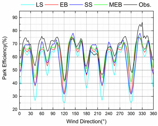 where M is the number of wind turbines in the wind farm. The Jensen model is integrated with four superposition models to calculate the park efficiency under all the wind directions with a span of 3°. In every direction, the inflow mean velocity is 9 m/s. Comparisons of the simulation results with field measurements are given in Figure 6. In general, all the four models could broadly predict the variation of efficiency with changing wind direction and the location of the extreme points. However, there still exist some biases between the model results and observations, especially for the LS model.