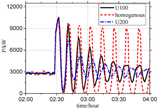 In fact, many studies [10,22] have shown that homogeneous load populations often result in strong oscillations, whereas well-diversified loads result in natural damping and a more stable aggregated response. Figure 5 shows a comparison of the aggregated responses of 2000 homogeneous and heterogeneous TCLs for a heat setpoint change from 23.3 °C to 24.4 °C. The power curves of 2000 houses with an average area of 185.8 m2 are shown. U100 and U200 represent the uniform distribution of the house area with a variance of (2 × 100)2/12 and (2 × 200)2/12 respectively. For the heterogeneous model, the suppression of load oscillations is strong and the higher the degree of dispersion of the aggregated units, the stronger the ability to suppress the oscillations is.