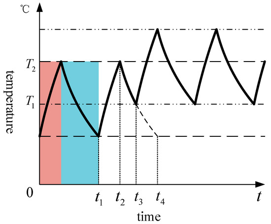 As mentioned above, the operating state of the air conditioning system is divided into the running period and the suspending period. In each period, the indoor air temperature can be obtained by Equation (9). The time required for the room temperature to reach a certain temperature value can be obtained by Equation (10).