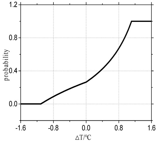 - If and if the air conditioner is in the running state, the state will not change; if it is in the suspended state, the next state will change according to the indoor temperature. The specific determination method is as follows. If , the pause operation state will occur in the next unit of time. If , the running state will occur in the next unit of time. In these two cases, the probability that the air conditioner is in the running state after increasing the setpoint temperature can be calculated using Equation (12).where ,