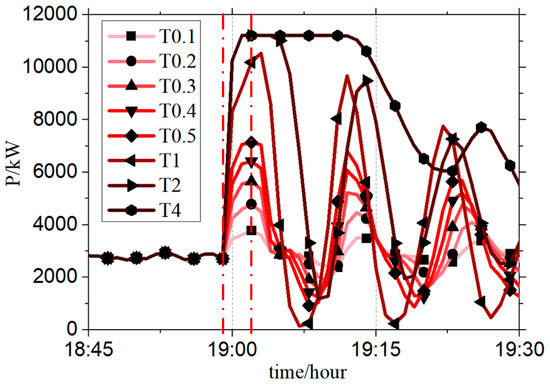 It is observed that in the heating mode, an increase in the setpoint temperature of the aggregate will cause an increase in the load. The range of values of the load limit of the virtual house model can be obtained using the relationship shown in Figure 7. Figure 8 shows that the load rebound of the aggregated unit contains the detailed models of 2000 air conditioning systems created in Gridlab-D; an increase in the temperature settings at a given moment can be determined. The rebound peak load shown in Figure 8 is in agreement with the relationship shown in Figure 7. However, the rebound peak load does not occur at the moment of changing the setpoint temperature; there is a short period of increase (shown as the red dotted line in Figure 8) because of the cycle time of the air conditioning compressor. This occurs because the compressor requires some time to return to the running state from the pause state. This time is called the cycle time.