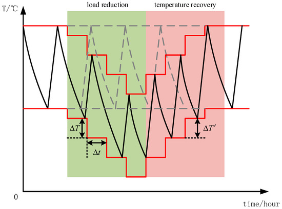 In the temperature recovery stage, the total load required to restore all the air conditioning systems to their original room temperature can be calculated by the aggregate model. Then, according to the rebound load limit value, the minimum time required (Tmin) to exit the DR can be obtained. Subsequently, the set temperature of the air conditioner can be calculated by Equation (14). is heterogeneous because the minimum control time (△t) is different in each air conditioner. As shown in Figure 9, the red background represents the temperature recovery state.
