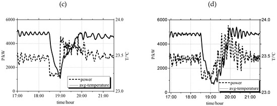 The load-average temperature curve of the aggregation under the demand response scheme. (a) represents the first scenario, (b) represents the second scenario, (c) represents the third scenario, and (d) represents the queuing method.