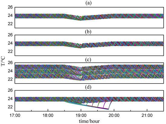 The specific parameters of the three scenarios are shown in Table 3. The first scenario represents the homogeneous model, in which the aggregated area of the houses is 185.8 m2. The second scenario represents the heterogeneous model with the same setpoint temperature; the aggregated area of the houses meets a uniform distribution and is 167–204 m2. The third scenario represents the heterogeneous model with the different setpoint temperatures; the aggregated area of the houses also meets the uniform distribution and is 167–204 m2. The initial setpoint temperature of the aggregated houses meets the uniform distribution at 23.3–24.4 °C. The average temperature is calculated for the virtual house model and broadcast to each air conditioning unit at a time interval of 5 min. The load-average temperature curve of the aggregated units under a DR scheme is shown in Figure 11; (a) represents the first scenario, (b) represents the second scenario, (c) represents the third scenario, and (d) represents the queuing method. Figure 12 shows the indoor temperature curves of 200 units randomly selected from the aggregated unit.