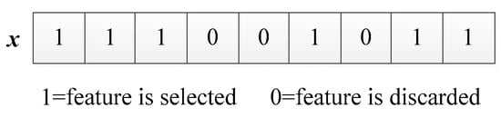 The wrapper method considers the feature selection as an optimization problem, and evaluates the feature subset by using certain search strategies and classification algorithms. Based on different search strategies, the wrapper method can be classified into the greedy search technique and the heuristic search technique. The former includes sequence forward search (SFS) methods and sequence backward search (SBS) methods, and the latter mainly includes genetic algorithms (GA) [], binary particle swarm algorithms (PSO) [], etc. Since the wrapper method combines the feature selection problem with the classification model, it often has a better performance than the filter method []. However, as the feature dimension increases, the wrapper method is usually preferred to obtain the local optimal solution of the problem.
