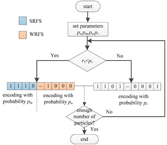 - Encode the particles in a completely random way. All the features are encoded with the original way, meaning that the value of pr is set to 0.5, and each feature has the same probability to be selected. The purpose of this operation is to increase the diversity of populations. Then, go to step 4.
