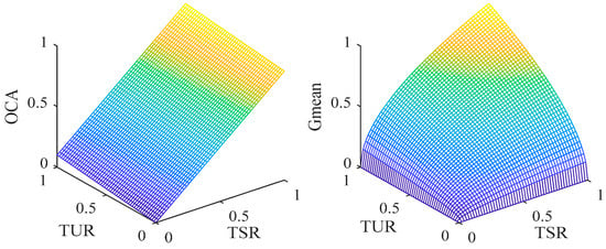The OCA index can be considered as the linear weighting of TSR and TUR, and the weight factor is related to the sample number of stable class and unstable class. Assuming that the sample number ratio of stable class and unstable class is 9:1, the comparison of OCA and Gmean is shown in Figure 3.