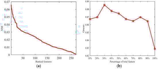 The individual feature ranking results based on the NMI values are shown in Figure 5a. Furthermore, different percentages of top-ranked features are respectively selected as the input features of KNN. The classification performance of these feature subsets with the training data is presented in Figure 5b.