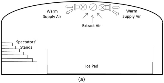 The reduction of energy use in buildings is a strategic research challenge, due to the significant contribution of the building sector in CO2 emissions. The reduction of energy use and the improvement in energy efficiency is strongly linked to the operations and performance of passive and active systems in buildings [1]. The potential for the reduction of energy demand has to be evaluated through the prioritizing solutions based on their energy efficiency [2]. Specifically, indoor ice arenas among the building sector are an enormous consumer of energy, due to their unique indoor conditions. The yearly energy consumption of a standard single ice rink arena is typically estimated to be between 1000–1500 MWh [3,4]. However, the range of individually measured energy consumptions is even larger, within 500–3500 MWh/year, which provides a great potential for energy savings [5]. The ice pad refrigeration and hall space heating are two major contributors to the energy use of the ice rinks. By default, to maintain a steady-state condition, the heat removed from the hall primarily by the refrigeration machinery needs to be roughly matched with the heat supplied into and generated inside the hall. In the case of an air-heated arena, the vast majority of the heat balance is maintained through a heated supply of air.