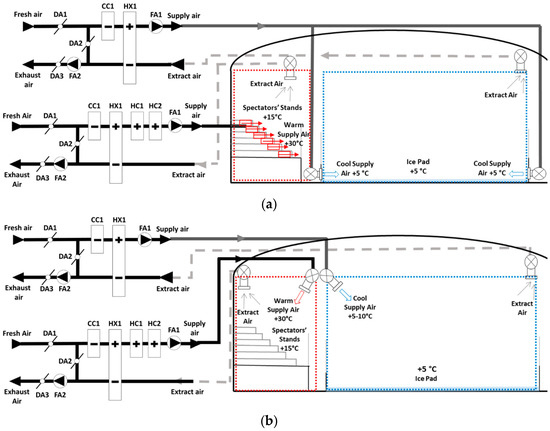 Figure 18 illustrates the air distribution strategies proposed by this study. As shown, the warmer air is supplied into the spectators’ zone, and the cooler air into the players’ zone. The air is extracted from the same zones similarly. The supply air terminals have to be as close to the occupants of the zones as possible. Two virtually separated zones are then created and subsequently, two different average temperatures are formed in each zone. The air distribution solutions reduce the risk of mixing the air within the zones. The virtual zones are indicated via dashed line boxes in the proposed air distribution models shown in Figure 18. As discussed earlier, such air distribution models more likely tend to approach the ideal temperature gradient of 1 °C/m on average. This study also verified that the lower temperature gradient results in lower cooling and heating energy demands, leading to more efficient planning of the AHU and air distribution systems. This is done by planning two separate supply and exhaust ducts, to avoid the mixing of warmer and cooler air in the main ducts. Therefore, the cooler air may not need to go through the heating coil. Moreover, it justifies the planning of two completely separate AHUs, one for the player’s zone, and the other for the spectator’s zone. A further advantage of this solution is that the spectators’ AHU does not need to run continuously. It may run conditional to the spectators’ presence, with the speed control being proportional to the number of spectators.