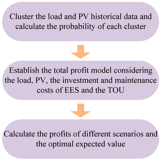 In a system that contains both consumers and PV, the ESS is installed. In order to minimize the consumer’s costs over the whole life of the ESS, we propose a method to size the energy storage system using the expected value model. As shown in Figure 1, which is the overall architecture of the expected value model, the basic steps are as follows: