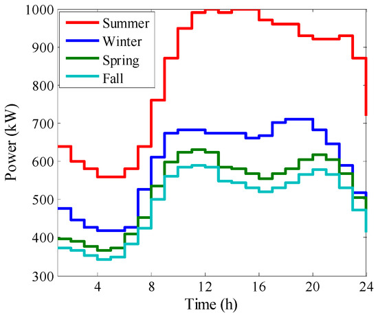 As shown in Figure 2, the consumer daily load data is from the literature [24]. The data is divided into four clusters corresponding to four seasons. It is assumed that the probability of each cluster is 25% and the maximum load is 1000 kW. The vertical axis is the load power. The horizontal axis is the time.