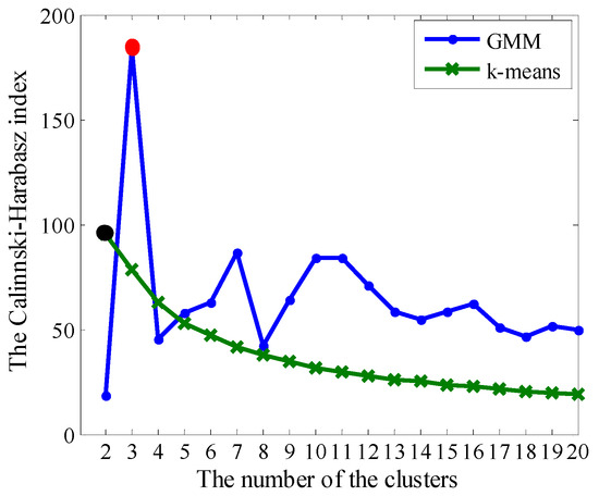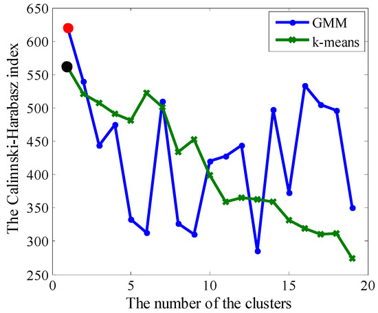 An important parameter for clustering using the Gaussian mixture model is the number of mixture models; that is, the number of clusters. In this paper, we use the Calinski-Harabasz [21] index to evaluate the number of clusters. The within-cluster variance is the square of the distance between each point in the cluster and the center of the cluster. The between-cluster variance is the square of the distance between the center points of each cluster and the center of the data set.