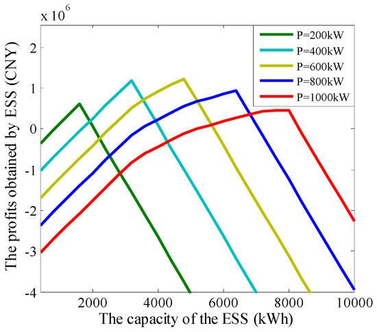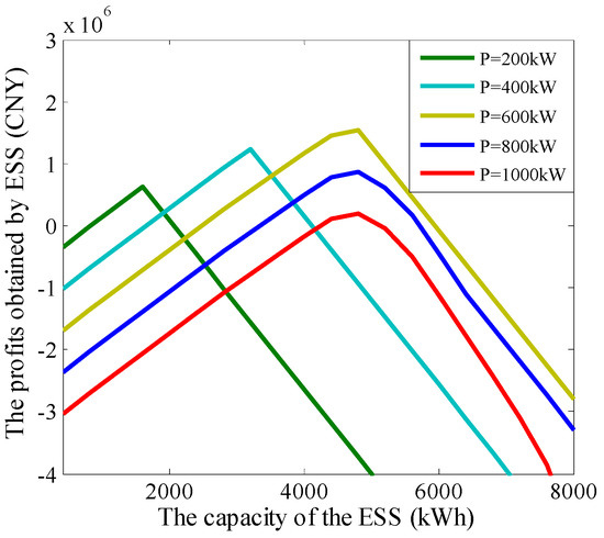 However, the variables are the power and the capacity in Equation (16). Therefore, we need to consider the impact of changes in the power, as well as the capacity variables. Figure 5 shows how the choice of power rating impacts the profits as the capacity of ESS is changed. The profit curves are illustrated at 200 kW intervals. The vertical axis is the profit accrued by the ESS and the horizontal axis is the capacity of ESS installed. We can see that each curve will first increase as the capacity increases and then decrease. Figure 5 shows that when the storage capacity exceeds an optimal size, the consumer cannot use this capacity, and it is essentially wasted. Clearly, the highest point represents the highest profits for systems of different power ratings. When the power is 400 kW, the highest point is 3200 kWh, which corresponds the best expected value in Table 3.