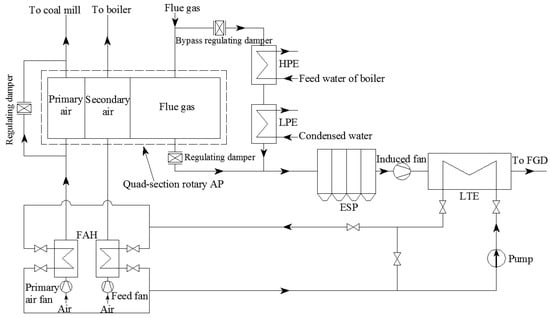 Traditional LTE–FAH system. AP: Air Preheater; FAH: Front located Air Heater; LTE: Low Temperature Economizer; FGD: Flue Gas Desulfurization.
