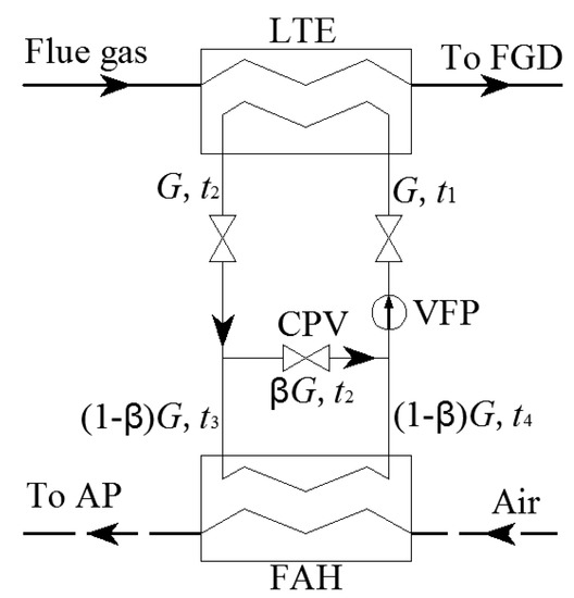 A traditional LTE–FAH system is described in Figure 3. The system can transfer the heat from the flue gas side to the air side. According to Equation (3), the EGT can be adjusted by changing the circulating medium flow of the closed circuit liquid loop. In order to control the EGT and the inlet liquid temperature of LTE more effectively and prevent low temperature corrosion on the rear heated surface, the LTE–FAH system was improved and is shown in Figure 4. The crossover pipe and crossover pipe valve (CPV) were added between the inlet and outlet pipe of the closed circuit liquid loop and the pump was replaced by a variable frequency pump (VFP). In order to facilitate automatic control, the CPV can use an electric valve. If the EGT or/and the inlet liquid temperature are lower than the designed values, the temperature can be controlled within a reasonable range by adjusting CPV and the frequency of VFP.