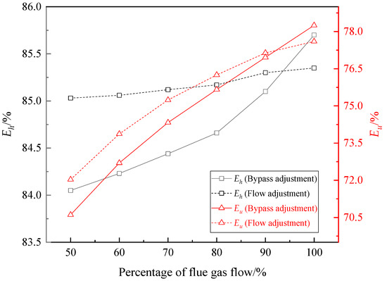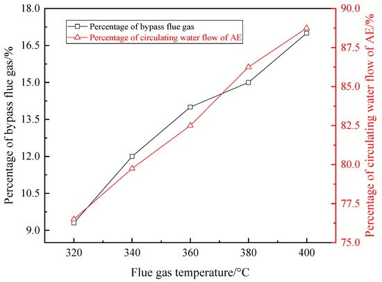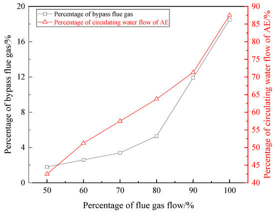 Under the conditions mentioned above, if the percentage of bypass flue gas flow to total flue gas flow was kept at 15%, the valve on the water side of AE was adjusted. If the EGT was higher than 85 °C, the heat recovered by AE was increased by increasing water flow of AE to decrease the inlet temperature of LTE, by which the EGT was reduced to 85 °C. If the EGT was lower than 85 °C, the water flow of AE was reduced to increase the EGT to 85 °C. The optimal percentages of circulating water flows of AE can be obtained under different total flue gas flows. The change curve of the flow percentage is illustrated in Figure 8. As the total flue gas flow proportion increased from 50% to 100%, the circulating water flow percentage of AE increased from 42.5% to 87.5%.
