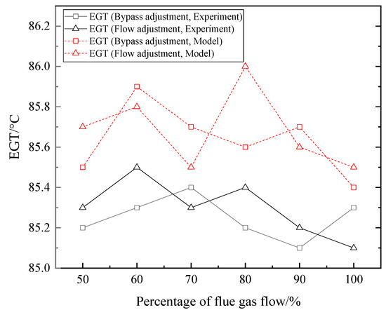 Keeping EGT at about 85 °C, as the total flue gas flow percentage increased, the changes of the recovered heat, waste heat recovery efficiency, heat efficiency, and unit efficiency of the system are shown in Figure 9 and Figure 10. The recovered heat, waste heat recovery efficiency, heat efficiency, and unit efficiency all increased regardless of regulating water flow or bypass gas flow. The recovered heat and all of the efficiencies varied more greatly when adjusting bypass gas flow. The measured EGTs under each operating condition were close to the EGTs calculated using dynamic model, as shown in Figure 11.