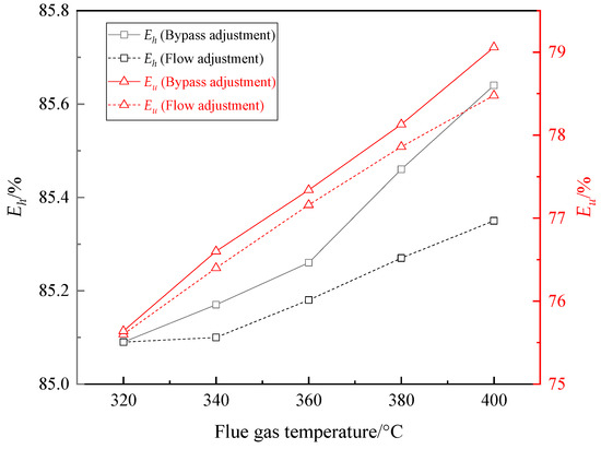 The total flue gas flow was kept at maximum value, and the air flow matched the flue gas flow. Similarly, the EGT 85 °C was considered as the adjustment target value. As the inlet flue gas temperature of AP changed, the bypass plug valve was adjusted to ensure EGT at about 85 °C with the opening of other valves unchanged, an optimal percentage of bypass flue gas flow to total flue gas flow can be obtained. When the flue gas temperature increased from 320 °C to 400 °C, the change curve of the percentage of bypass flue gas flow to total flue gas flow is given in Figure 12. With the rising of the flue gas temperature, the EGT remained at around 85℃ by increasing the bypass flue gas flow percentage constantly from 9.3% to 17.0%.