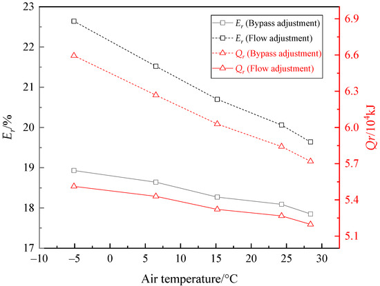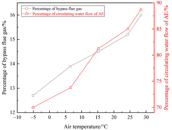 - As the ambient air temperature rose from –5.1 °C to 28.4 °C, the bypass flue gas flow percentage increased from 12.7% to 16.0%, or the circulating water flow percentage of the AE increased from 70.00% to 88.75% to maintain the EGT at about 85 °C, and the recovered heat and waste heat recovery efficiency decreased.