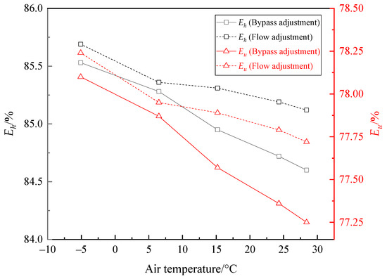 In order to obtain the adjustment strategy when the ambient air temperature changes, experiments were carried out in a period with relatively stable air temperature in different seasons. The flue gas temperature was kept at 380 °C, and the total flue gas flow was kept at maximum value. As the air temperature changed, the bypass plug valve was regulated to ensure the EGT at around 85 °C with the opening of other valves unchanged. When the ambient air temperature rose from −5.1 °C to 28.4 °C, the percentage of the bypass flue gas flow increased from 12.7% to 16.0%, as shown in Figure 16.