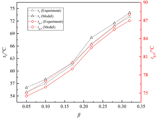 In the experiment, water was used as the circulating medium, considering waste heat recovery efficiency and preventing low temperature corrosion, the designed value of EGT was 85 °C and the designed value of the inlet water temperature was 69 °C. Keeping the flue gas flow, air flow, inlet flue gas temperature of LTE and the frequency of VFP at constant values, the flow coefficient β of the crossover pipe was adjusted. The change curves of tg,o and t1 are displayed in Figure 20. With the rising of β, tg,o and t1 increased continuously. As β rose from 0.05 to 0.32, tg,o increased from 55.5 °C to 73.4 °C, and t1 increased from 74.5 °C to 87.1 °C. The measured tg,o and t1 were close to the temperatures obtained using dynamic model, as shown in Figure 20.