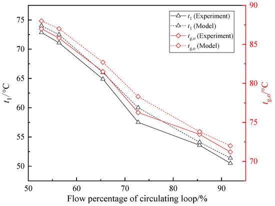 Closing CPV, the inlet flue gas temperature of LTE was maintained at 115 °C, the others parameters remained unchanged, and the frequency of CFP was adjusted to increase the water flow percentage of the circulating loop. As the water flow percentage of the circulating loop increased from 52.72% to 91.81%, tg,o decreased from 86.9 °C to 71.2 °C, and t1 decreased from 72.9 °C to 50.5 °C, as shown in Figure 21. The measured tg,o and t1 were also close to the temperatures calculated by the model.