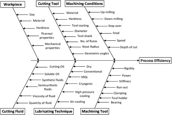 Figure 3 shows the cause-effect diagram for the efficiency of the machining process. In the current study, machining parameters (spindle speed, feed rate, depth of cut, and width of cut) were selected.